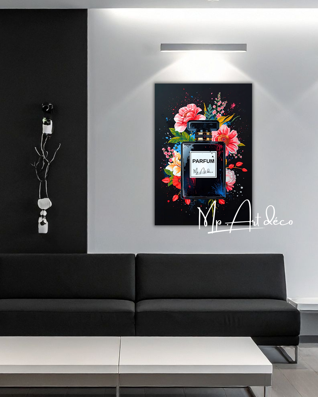 Le flacon de parfum noir, mis en valeur par un fond floral éclatant, apporte une touche de luxe et de couleur à votre salon, chambre ou espace professionnel.